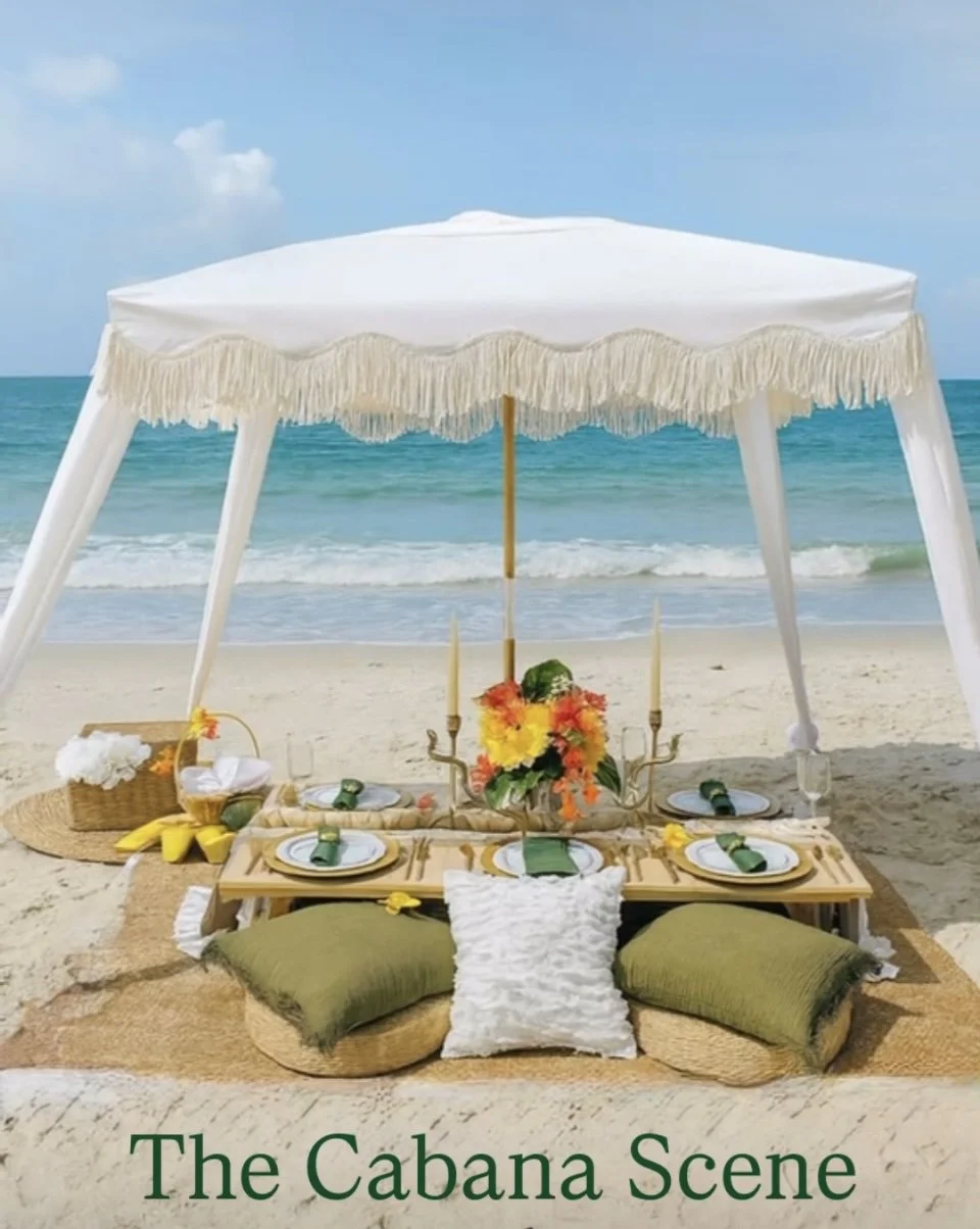 A tropical haven under your own cabana canopy. Breezy linens, vibrant accents, and island-inspired details create an oasis perfect for birthdays, girls’ nights, or a carefree afternoon in paradise.