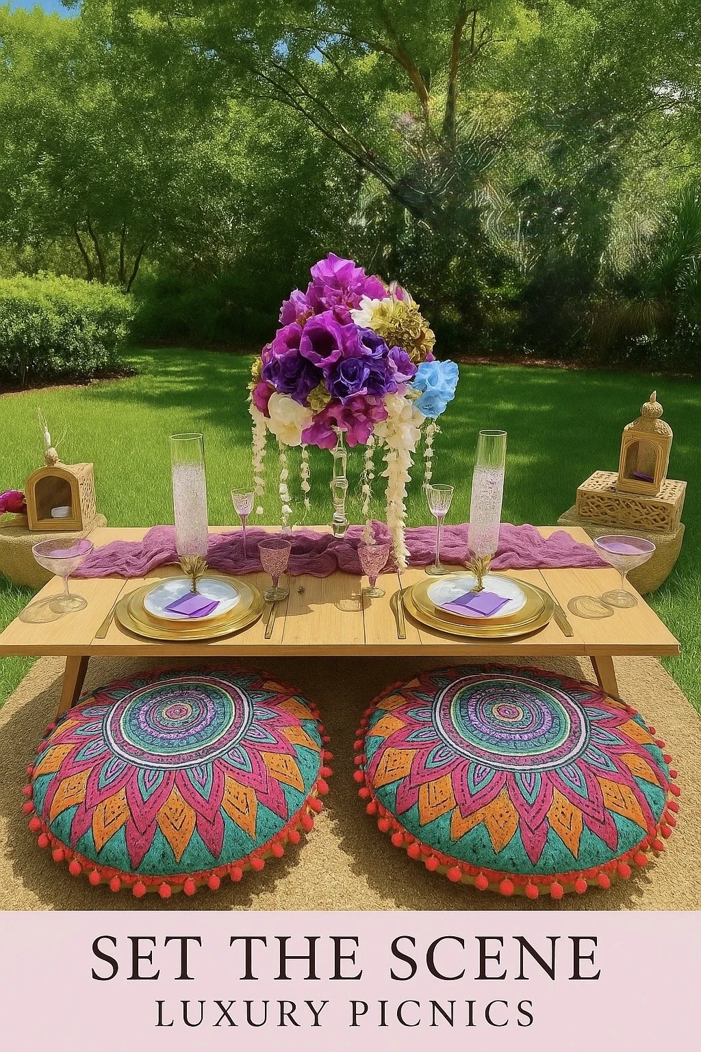 ✔️ Full luxury picnic setup (low table, plush seating, styled décor)